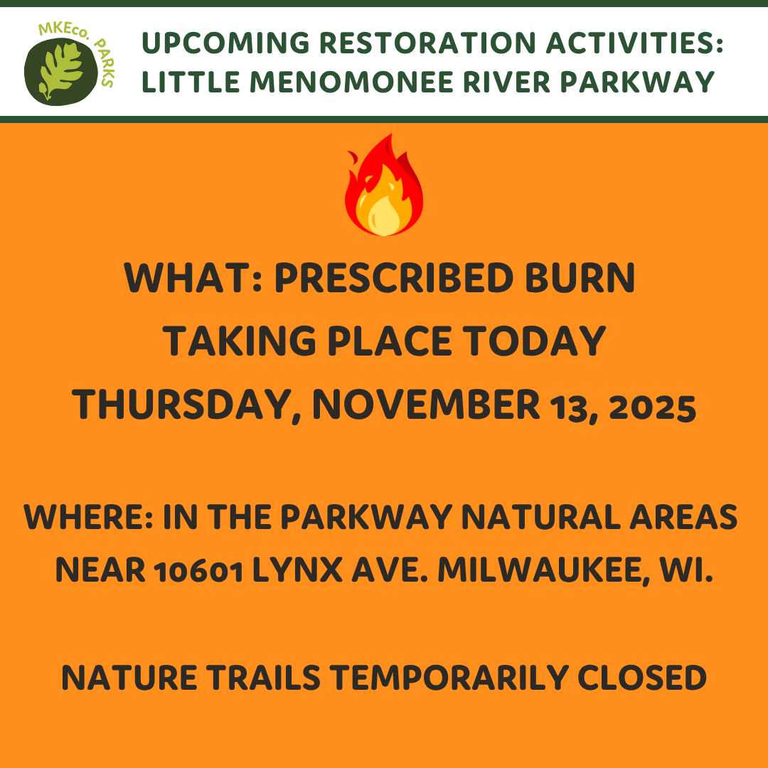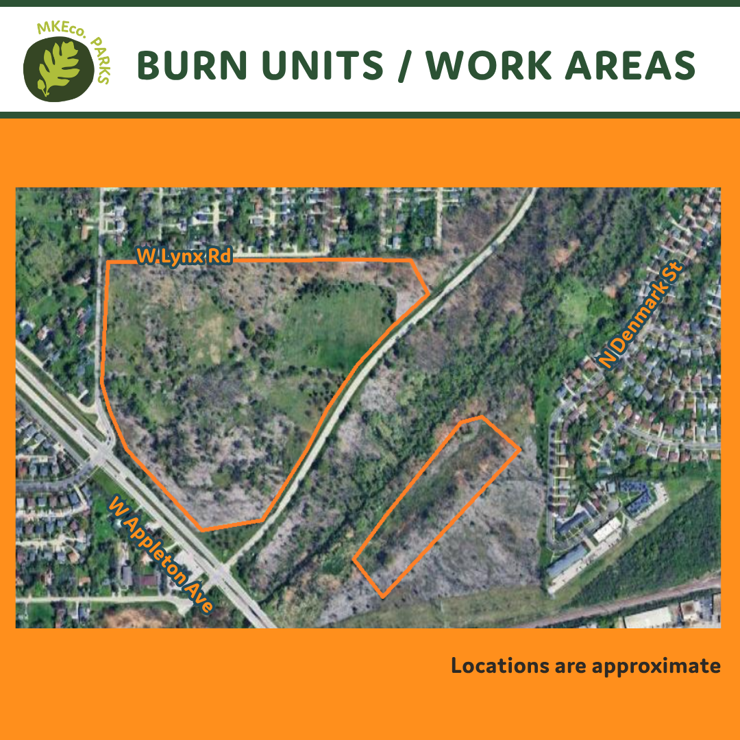 LMRP Section 4 & 5 Habitat Restoration -It's burn season - Part 2. This spring we had hoped to conduct a prescribed burn in Section 5 of the Parkway (Between Fond du Lac Avenue to Appleton Avenue), but weather conditions did not align. We are now anticipating a fall burn. Activities will take place within parkway natural areas near 10601 Lynx Ave. Milwaukee, WI (See map below).
