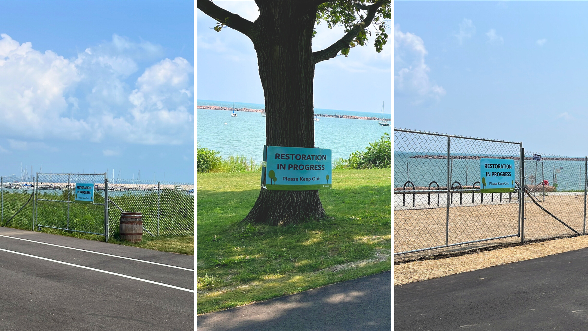 Additional locations have been posted with "Restoration in Progress - Please Keep Out" signs. These are also undergoing lawn restoration.
