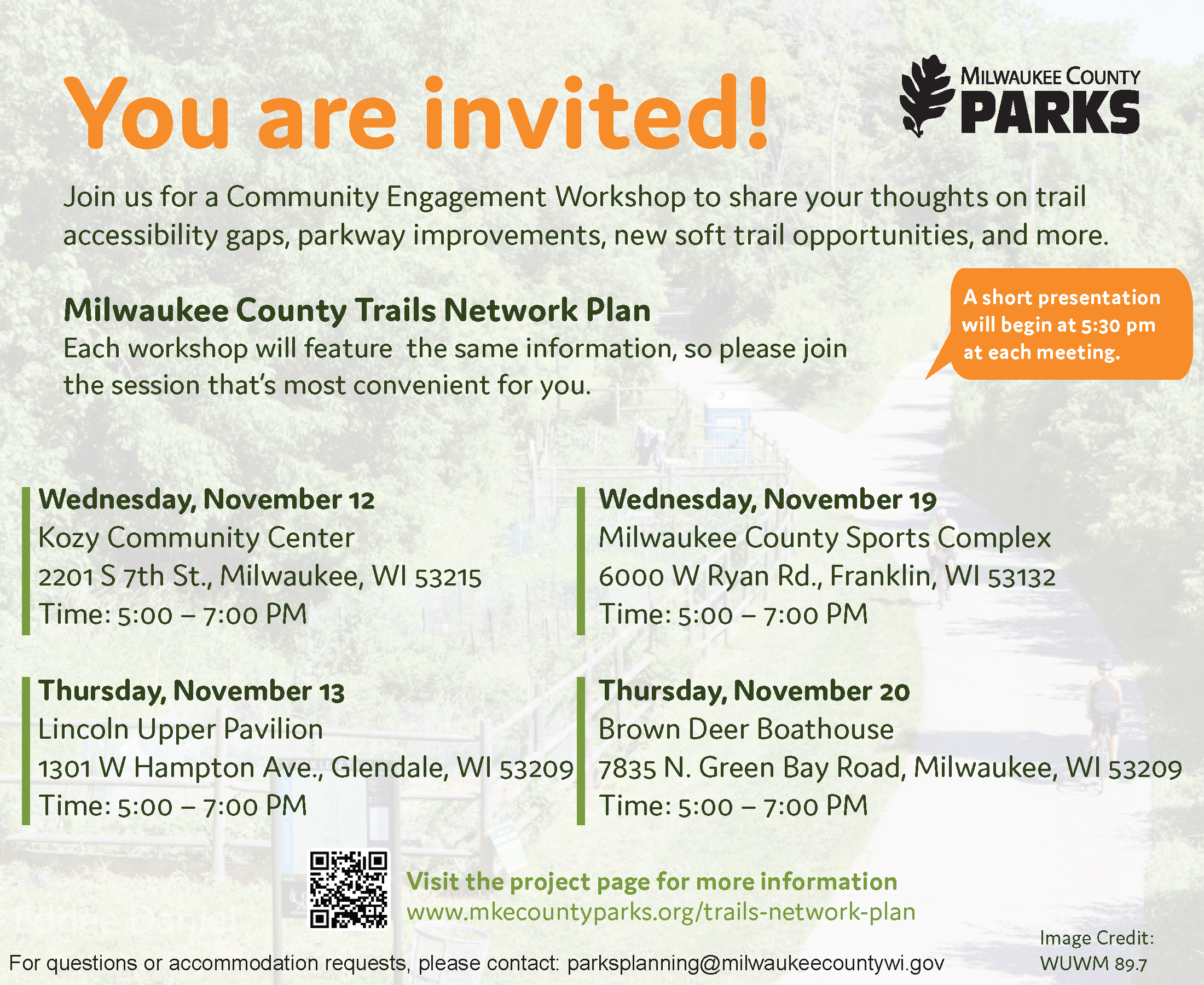 The Trails Network Plan presents a unique opportunity for Milwaukee County residents to engage in a discussion about how to improve our trail system within the county. Community engagement will take place in three phases, and will include meetings with community advisory groups, community workshops & open house events, pop-up events throughout the county, and online engagement activities.